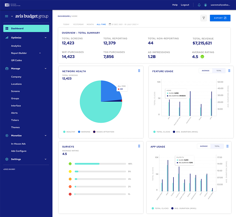 The Avis Budget Group Admin Panel is a white-labeled version of Edison’s device management and content delivery platform. The Avis Admin Panel tracks inventory and controls thousands of screens across the country.