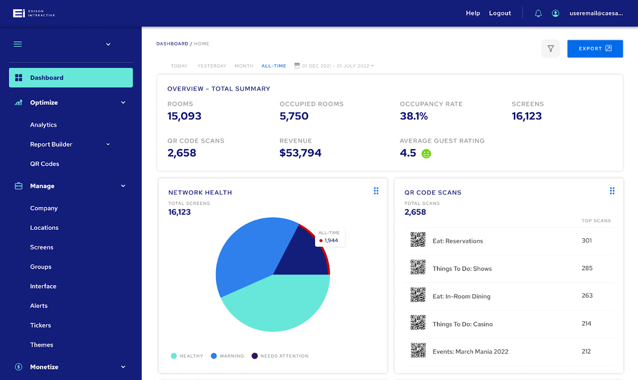 Harness the power of data. The Edison Platform provides unique access to analytics, giving hotel operators insights into guest interactions and usage. Real-time data and analytics, network health, feature usage, unique QR code scans, guest survey results, pay-per-view revenue, impression and advertising reports and so much more.